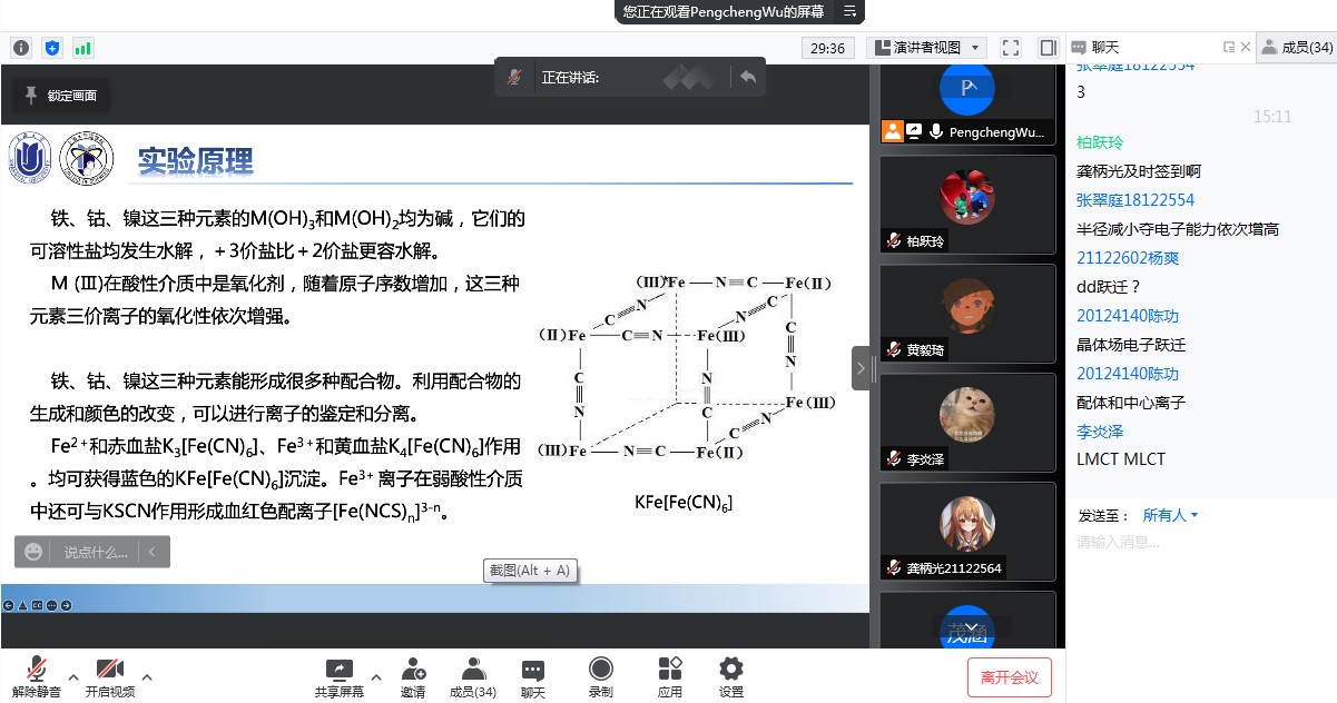 线上的无机实验课虽然我不能亲身去做这些实验,但是通过老师的细致讲解和看视频,我更能掌握这些实验的实验原理与具体的实验过程,更能仔细观察到实验现象。同时课堂上通过老师的提问,我对这些实验的重点有了更深的领悟。(丁安琪 20124667)