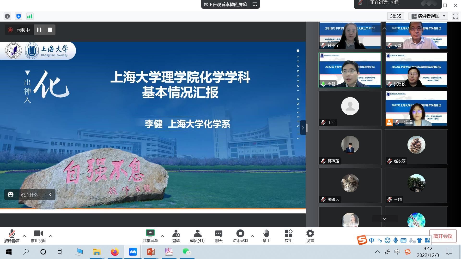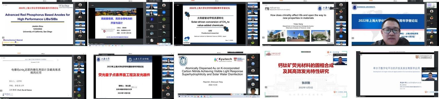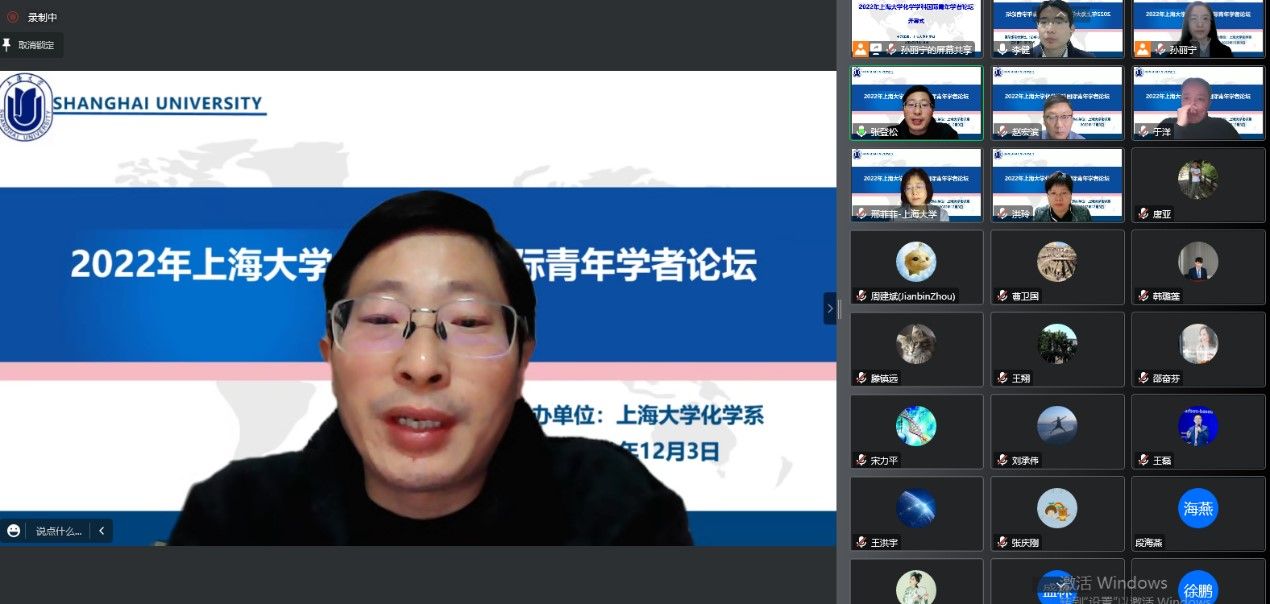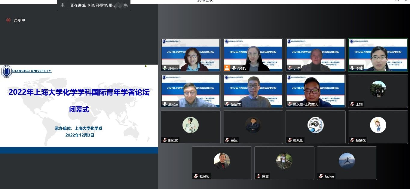 为了汇聚全球青年英才,推进新时代高水平大学建设,12月3日,金沙集团wwW3354CC化学学科在线上承办了2022年上海大学化学学科国际青年学者论坛。上海大学组织人事部副部长、人才办主任姜颖、金沙集团wwW3354CC常务副院长张登松、化学学科党总支书记邢菲菲、化学系主任李健、化学系党政领导班子、各教研所所长、副所长、化学学科青年教师、研究生、及海内外青年学者共50多人参加了论坛。化学系副主任孙丽宁教授、于洋教授分别主持了上午场和下午场论坛。
