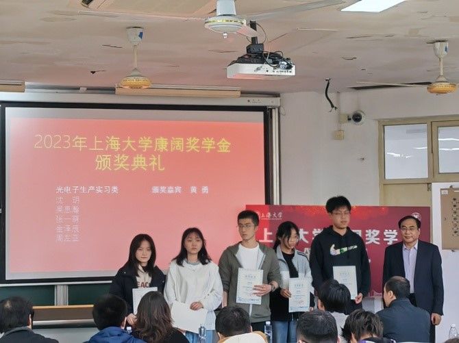 物理系党总支书记颜明老师宣读了2023上海大学康阔光电子实习奖学金获奖名单。并由黄勇先生、姚颖冲副书记、葛先辉主任分别为获得生产实习类、科技创新与竞赛类和春招特色类的同学颁发了荣誉证书。