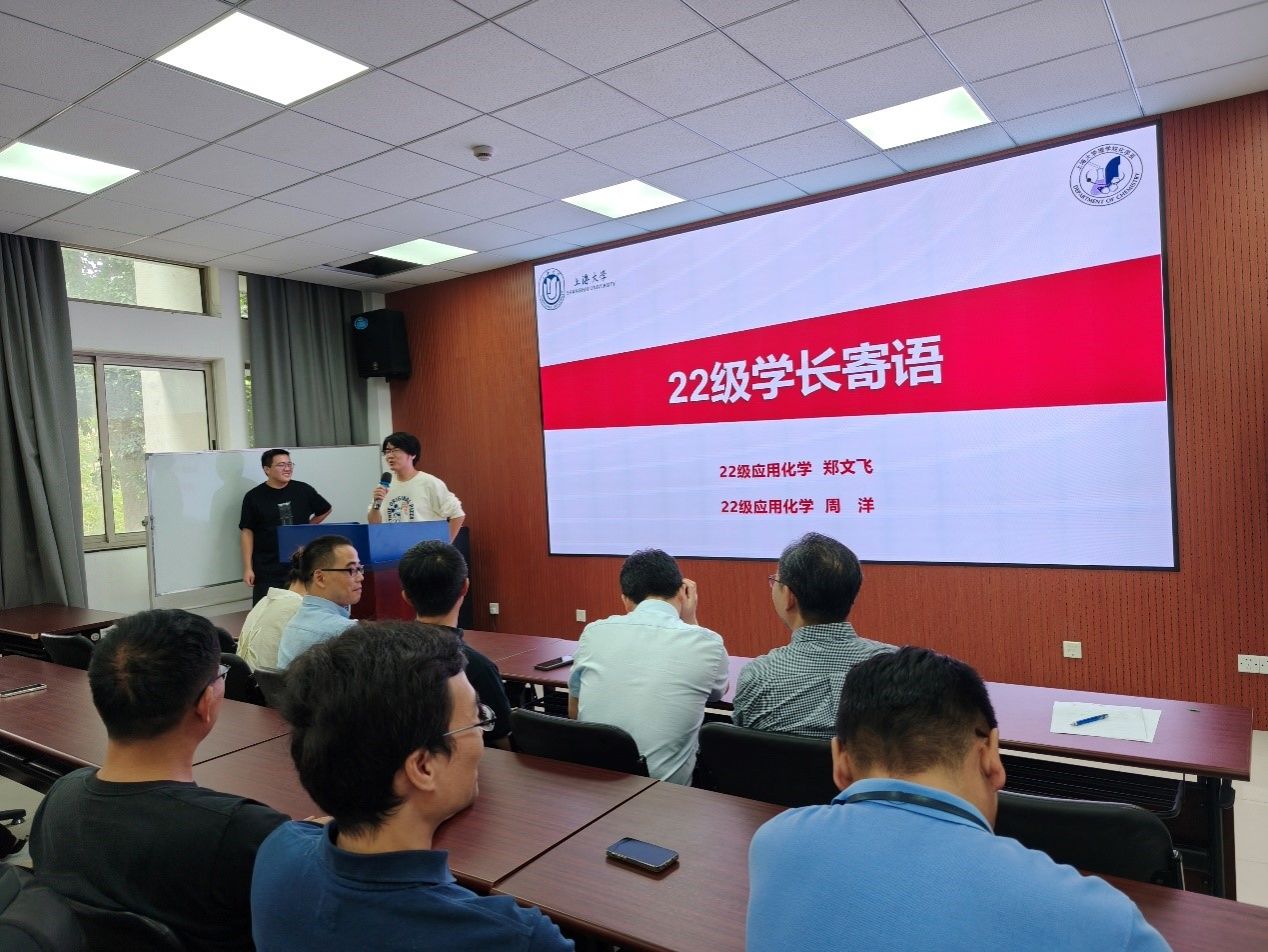 两位22级的优秀学长寄语23级应用化学专业的同学们,郑文飞学长通过讲述学长们保研小故事,向同学们阐述了学好专业知识以及参与专业竞赛,拥有科研经历的重要性;周洋学长强调兴趣的重要性,要通过与全程导师的联系,去探索真正适合自己的方向,用理论去指导自己的实验。