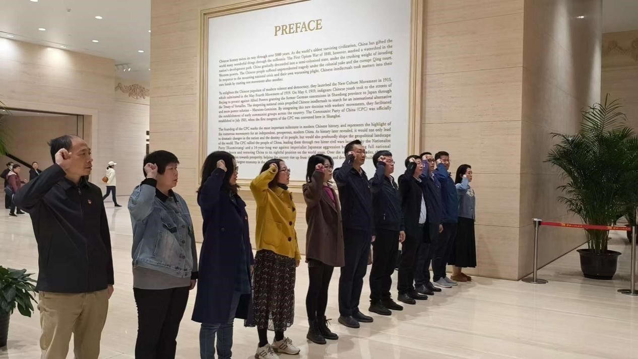 11月22日,金沙集团wwW3354CC党委书记于瑞强、党委副书记、常务副院长张登松以及党委中心组成员和党员师生代表集体参观了中共一大纪念馆,进一步学习党的发展历程与先辈的革命精神,从伟大党建精神中汲取团结奋斗的磅礴力量。