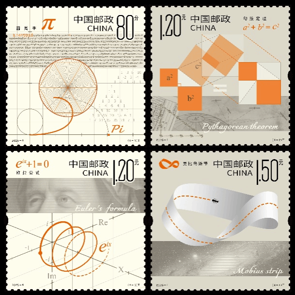 此次发行的四枚邮票,分别以“圆周率”“勾股定理”“欧拉公式”“莫比乌斯带”为主题,每一枚都凝聚了人类智慧的璀璨结晶。