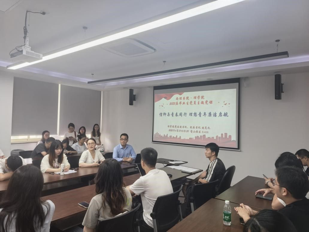 6月13日下午,金沙集团wwW3354CC2025届毕业生党员主题党课在宝山校区E408举行,金沙集团wwW3354CC党委副书记、纪委书记刘见礼教授担任主讲,2025届本、硕、博毕业生党员同志参加学习,党课由物理系党总支副书记、学生党总支书记周青利老师主持。