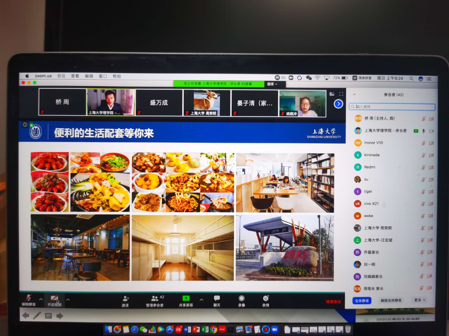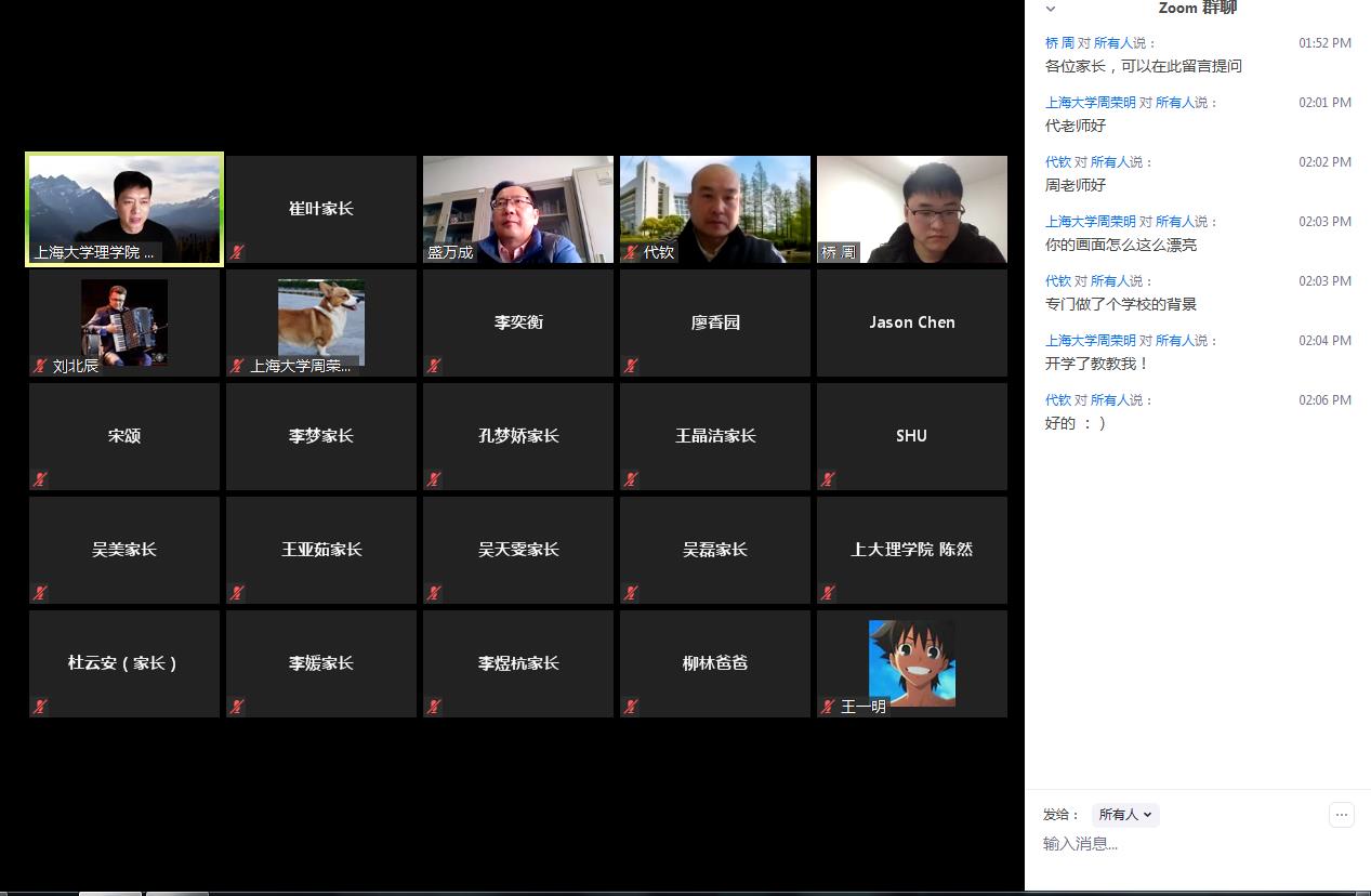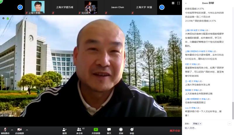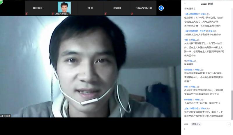 2020年4月5日14时,上海大学本科招生广西壮族自治区专场在Zoom会议室顺利进行。上海大学招生与毕业生就业办公室叶亮、刘北辰、宋颂,金沙集团wwW3354CC党委书记盛万成、党委副书记陈然、党委副书记姚颖冲、副院长余长君、徐甲强、陈玺、学院招生就业主管周荣明以及来自广西的考生和家长朋友们一起相聚云端,会议由金沙集团wwW3354CC团委副书记周桥主持。