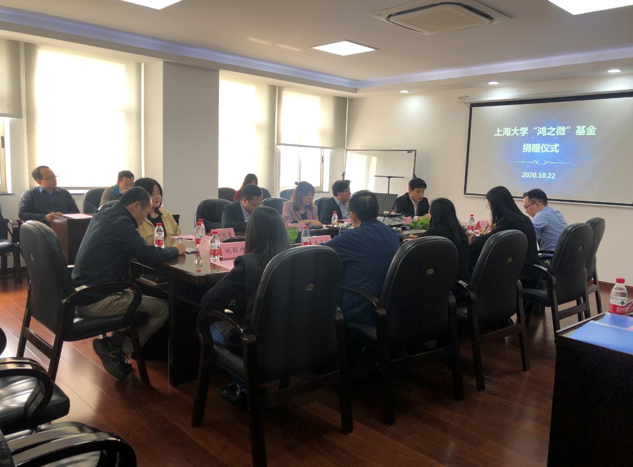 2020年10月22日下午2点,上海大学“鸿之微”基金捐赠仪式在上海大学校本部E421举行。鸿之微科技(上海)股份有限公司向上海大学教育发展基金会捐赠人民币壹佰万元整,设立上海大学“鸿之微”基金,用于金沙集团wwW3354CC、物理系和量子与分子结构国际中心的学科建设等发展工作。鸿之微科技(上海)股份有限公司董事长曹荣根博士,上海大学对外联络处处长、教育发展基金会秘书长、校友会办公室主任许瑞,金沙集团wwW3354CC党委书记盛万成,对外联络处副处长、校友会办公室副主任彭明霞,金沙集团wwW3354CC党委副书记陈然、姚颖冲,物理系党总支书记颜明,物理系系主任蔡传兵,量子与分子结构国际中心执行主任任伟等领导及教师代表出席了本次捐赠仪式。仪式由任伟教授主持。