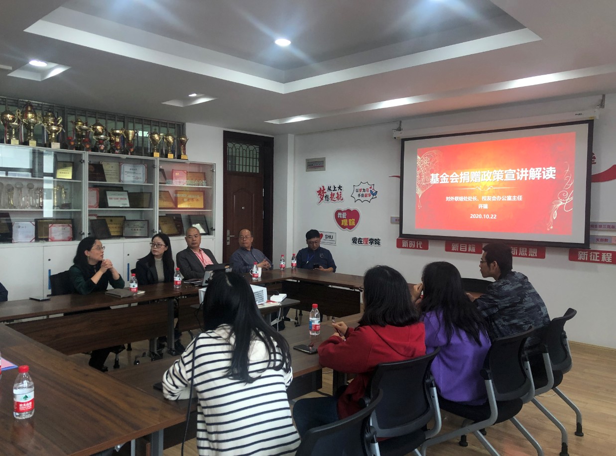 10月22日下午3点,金沙集团wwW3354CC在E512会议室顺利召开了基金会捐赠政策宣讲解读会。上海大学对外联络处处长、教育发展基金会秘书长、校友会办公室主任许瑞应邀作为主讲嘉宾,对外联络处副处长、校友会办公室副主任彭明霞,金沙集团wwW3354CC党委副书记姚颖冲,金沙集团wwW3354CC副院长张登松、徐甲强,对外联络处基金工作主管姜芬芬,化学系党总支书记陈雅丽,化学系系主任曹卫国,各系青年教师代表等参加了本次解读会。本次会议由金沙集团wwW3354CC党委副书记姚颖冲主持。