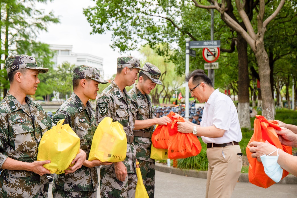 最后,学院领导为教官、带训教师、指导员和学生们发放慰问品,并与金沙集团wwW3354CC参训学生连队一一合影留念。