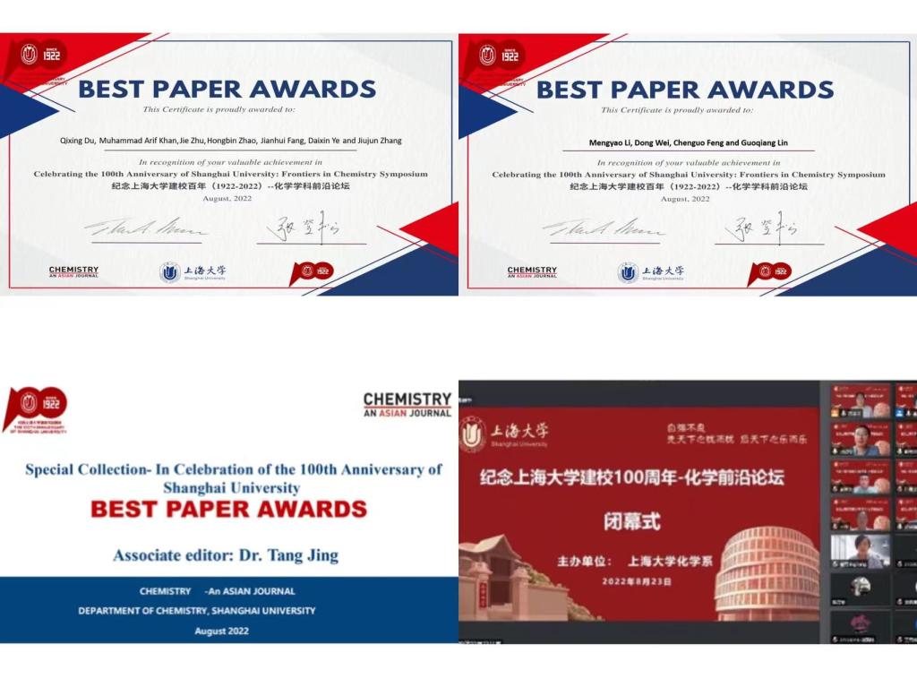 闭幕式上,《Chemistry-An Asian Journal》副主编唐竞博士为八位获得最佳论文奖的作者颁发证书并表示热烈祝贺。金沙集团wwW3354CC常务副院长张登松致闭幕词,感谢为纪念上海大学建校百年送来祝福和精彩报告的各位专家,勉励所有参加论坛的师生,继承和发扬百年上大的光辉校史、努力工作、奋发有为、再续新辉煌、再创新佳绩。此次化学前沿论坛的成功举办,使师生对化学研究的前沿领域和发展方向有了更加深刻的理解,开阔了学术视野、促进了创新能力的提升和科研水平的进步,助力上海大学化学学科建设和人才培养再上新台阶。