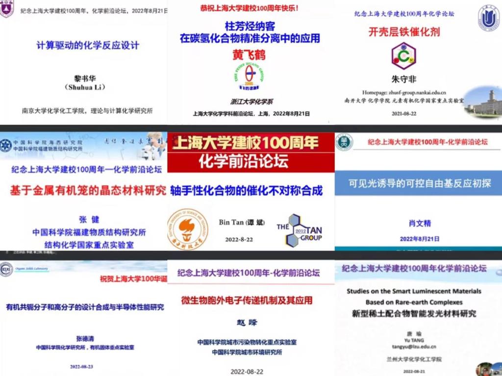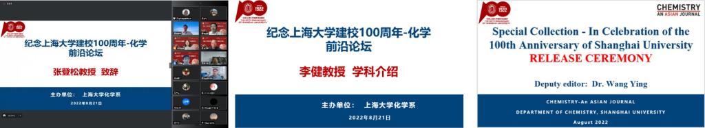 十秩春秋、薪火相传、百年上大、笃行不怠。化学学科纪念上海大学建校100周年系列活动之一“化学前沿论坛”于近日在线上成功举办。来自国内高校和科研院所的25位知名学者为化学学科的广大师生带来了一场场精彩的前沿学术报告。论坛的举办旨在加强化学学科前沿学术交流,拓宽师生的创新思维和学术视野,搭建高层次科研合作平台,助推学科建设和人才培养,共谋化学学科新发展。论坛开幕式期间,Willey旗下《Chemistry-An Asian Journal》纪念百年上大的专刊正式发布。