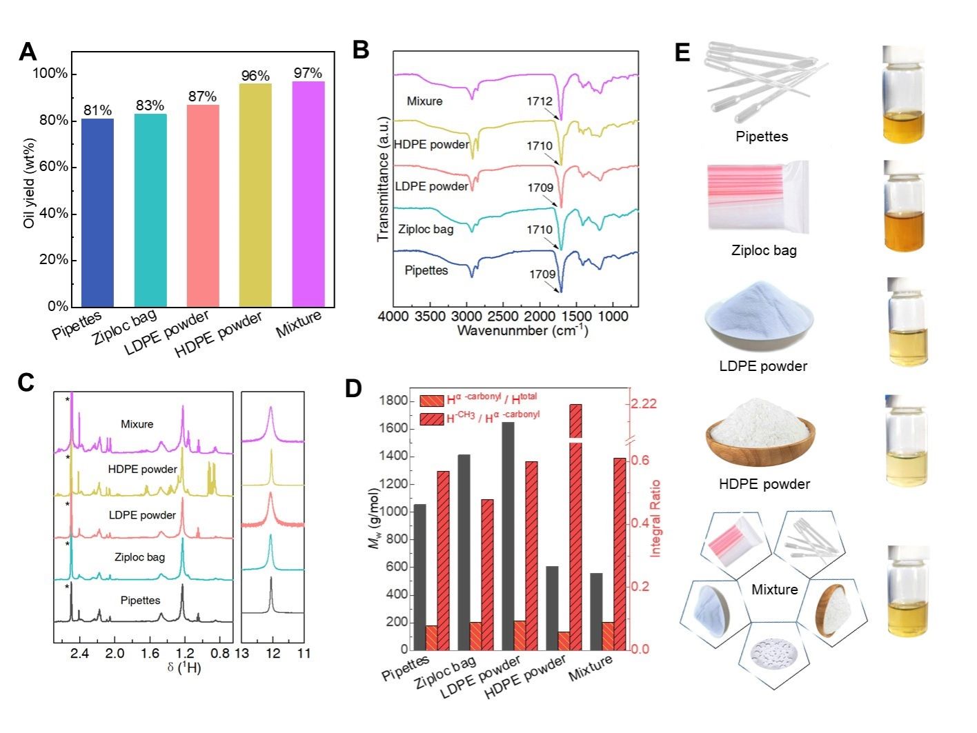 塑料自发明以来极大方便了人们的生产生活,然而大多数塑料在使用后被简单填埋或焚烧,严重威胁生态环境和人们健康。化学法是当前塑料升级回收利用的前沿方向,但在相对温和的条件下获得高附加值化学品还存在着巨大的挑战。该工作提出了一种无氢温和条件下的催化氧化升级回收新策略,将PE塑料转化为长链二元酸。以Ru/TiO2为催化剂,空气、水为介质、在1.5 MPa的压力和160 ℃的温度下,将PE塑料升级回收为长链二元酸,收率高达85%。该方法可应用于生活中的聚乙烯塑料制品催化转化,获得的长链二元酸在航天及军工用特殊润滑油、高级香料、高性能尼龙工程塑料、高温电介质、高级润滑剂等产品的生产中有重要应用。该策略有望应用于PE的大规模升级回收,为废弃塑料的高价值回收提供新思路。