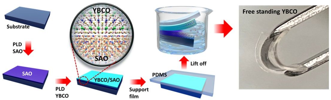 高温超导技术的发展对国家的科技竞争力至关重要,在高温超导领域取得突破意味着在关键技术和创新方面走在世界前沿,增强国家的科技实力和国际声誉。高温超导重点实验室的这项工作对于实现柔性高温超导氧化物薄膜器件的制备具有关键作用,为通过转移技术构建新型高温超导异质结器件奠定了基础。高温超导材料的应用潜力巨大,在能源、交通、医疗、通讯、国防和太空等领域具有得天独厚的优势,可以推动产业升级和经济发展。高温超导YBa2Cu3O7-δ(YBCO)薄膜在液氮温区具有优秀的超导性能,以其制备的高温超导电子器件显示了比传统器件更优越的性能。若其与柔性电子结合,将为可穿戴设备、传感技术、医学诊断和量子计算等领域带来革新。高质量的YBCO薄膜通常需要使用单晶衬底才能保证其定向外延结构与双轴织构,而单晶通常是刚性衬底,使YBCO薄膜无法应用于柔性电子器件当中,所以如何获得高质量的柔性YBCO薄膜成为关键。
