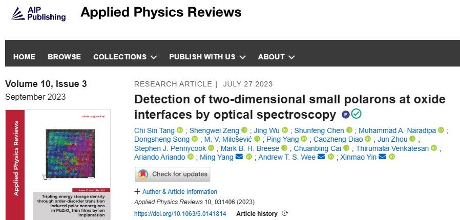 近日,物理系上海市高温超导重点实验室尹鑫茂教授等合作者在美国AIP旗下顶级应用物理期刊《Applied Physics Reviews》发表题为《Detection of two-dimensional small polarons at oxide interfaces by optical spectroscopy》的论文,并被编辑部甄选为期刊亮点论文(Featured Article)。金沙集团wwW3354CC陈智新兼职教授为第一作者,尹鑫茂教授为论文的通讯作者,上海大学物理系上海市高温超导重点实验室是论文的第一完成单位和通讯单位。上海市高温超导重点实验室的蔡传兵教授、研究生陈顺风等也参与了部分工作。