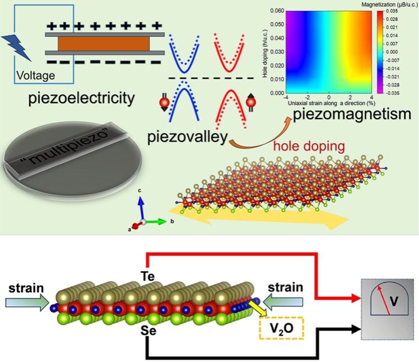 本研究首次设计了Janus双面单层altermagnetic(交替磁性)材料V2SeTeO,并预言了其具有的新奇“多压”效应。奇特的交替磁性磁构型实现了C-paired晶体能带谷极化机制,这使得实验上可以通过面内单轴应变实现谷极化,从而得到压谷效应。在此类压谷效应的基础上加上适当的空穴掺杂,可以进一步调节费米能级附近相反方向自旋的能带,从而实现压磁效应。研究还表明Janus结构天然的面外对称性破缺可以产生一个面外压电。值得一提的是,该材料的压电效应和压磁压谷效应都十分优异,压电效应中的压电系数为e32=e31= 0.322×10−10 C/m,在4%拉伸应变下可以得到128meV的谷极化强度,在4%拉伸应变加上0.02h/u.c.的空穴掺杂可以得到0.020μB的净磁矩。因此本工作预言了二维材料体系中的多压效应,为理论设计多功能纳米器件提供了新思路,在纳米电子学、光电子学、自旋电子学和谷电子学方面有潜在的应用。