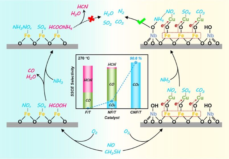 上海大学碳中和创新研究中心张登松教授团队通过在TiO2负载的Cu改性Nb-Fe复合氧化物催化剂上构筑的深度氧化位点实现了选择性协同催化消除NOx和CH3SH,该催化剂具有优秀的NOx和CH3SH催化去除性能,并拥有优异的N2和CO2选择性。作者结合XPS、原位拉曼光谱和原位漫反射红外光谱表征,阐明了从Nb-Fe复合氧化物到Cu氧化物的持续的电子转移诱导生成了催化剂表面深度氧化位点。该位点可以将毒副产物CO的前驱体HCOOH深度氧化为CO2,从而避免HCOOH进一步和NH3结合生成毒副产物HCN的前驱体HCOONH4(图1)。本工作对大气污染控制领域NOx与VOCs等多污染物的协同净化具有重要意义,为未来设计高效选择性协同催化去除NOx和SVOCs提供了有效的策略和理论依据。