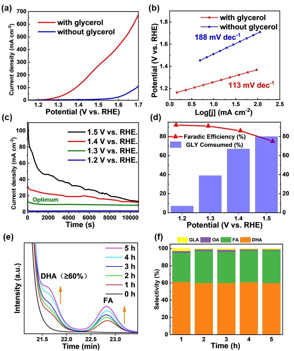 甘油是生物柴油制备的废弃物,利用甘油制备得到高价值的化学品备受关注。同时利用甘油电氧化(GOR)取代电解水中析氧反应提升电解效率是一项十分有效的节能途径。
