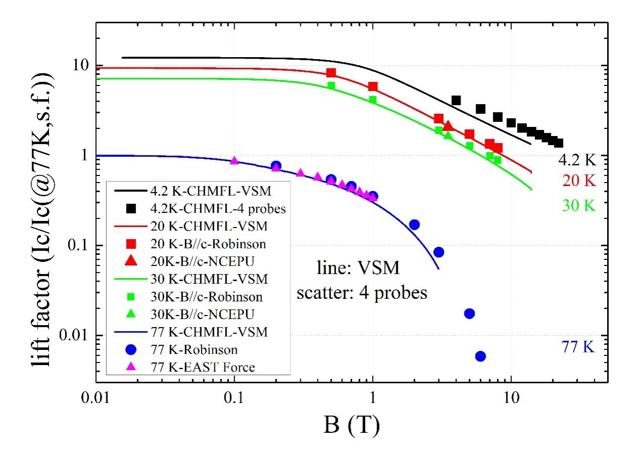 图3. 新型YBCO纳米复合带材在不同温度和磁场下的磁传输提升因子