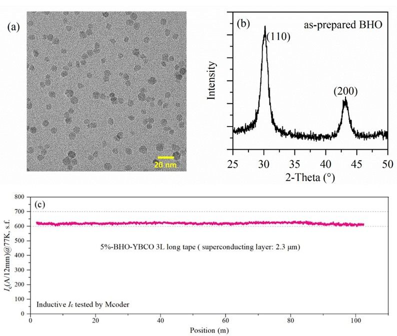 图1. 可控制备的BHO纳米晶及连续化百米级的YBCO复合长带超导性能