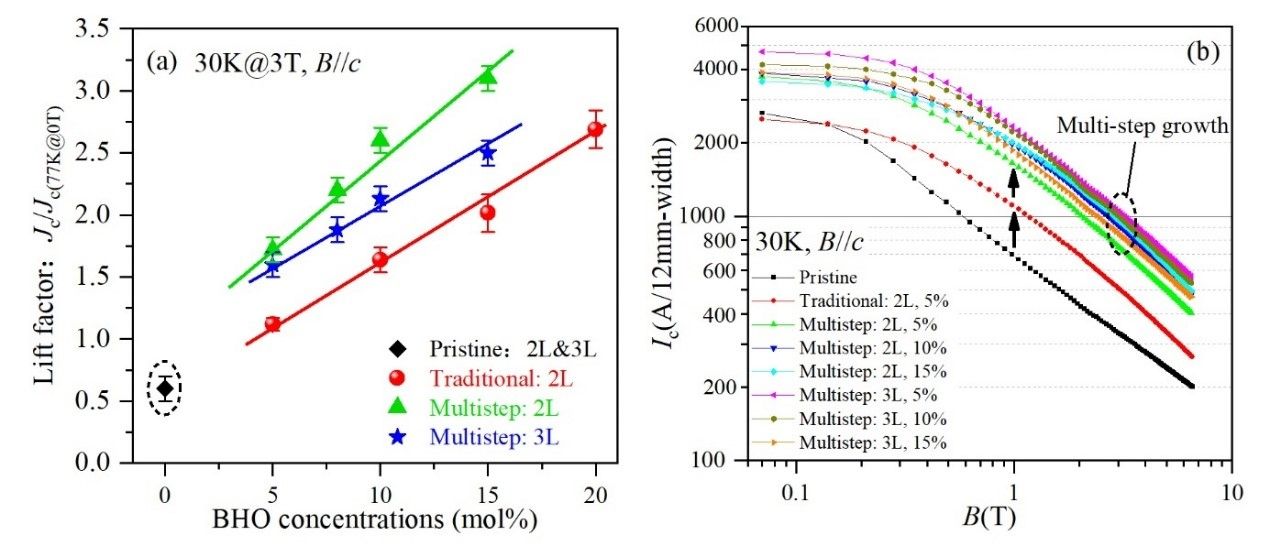 图2. 新型YBCO纳米复合带材的磁传输提升因子和在场载流性能