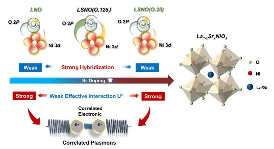 镍酸盐与高温超导铜酸盐在结构和电子特性上具有相似性,促使科研界对镍酸盐超导性进行探索,最新研究发现无限层镍酸盐薄膜具有超导性且其单晶体系的超导转变温度已达到液氮温区。镍基超导的发现不仅为纳米尺度下强关联材料电子相的精确控制提供了实证,也为非常规超导机理的探究开辟了新思路。此外,在强关联氧化物中,金属等离激元现象已成为学术界的研究热点,促进了基础科学研究及其潜在应用的快速发展。理论分析表明,在Mott体系中考虑短程及长程库伦相互作用时,会激发具有多个有序光子能量的关联等离激元,其源于体系内关联电子的集体振荡,并已在铌酸盐、铜酸盐等强关联体系中被报道。LaNiO3作为镍基超导的母体材料和典型的强关联材料,其Ni-O轨道杂化在解释量子多体问题中至关重要,然而在促进等离激元形成中的作用尚未充分探索,这可能为揭示镍基超导机理研究提供关键线索。