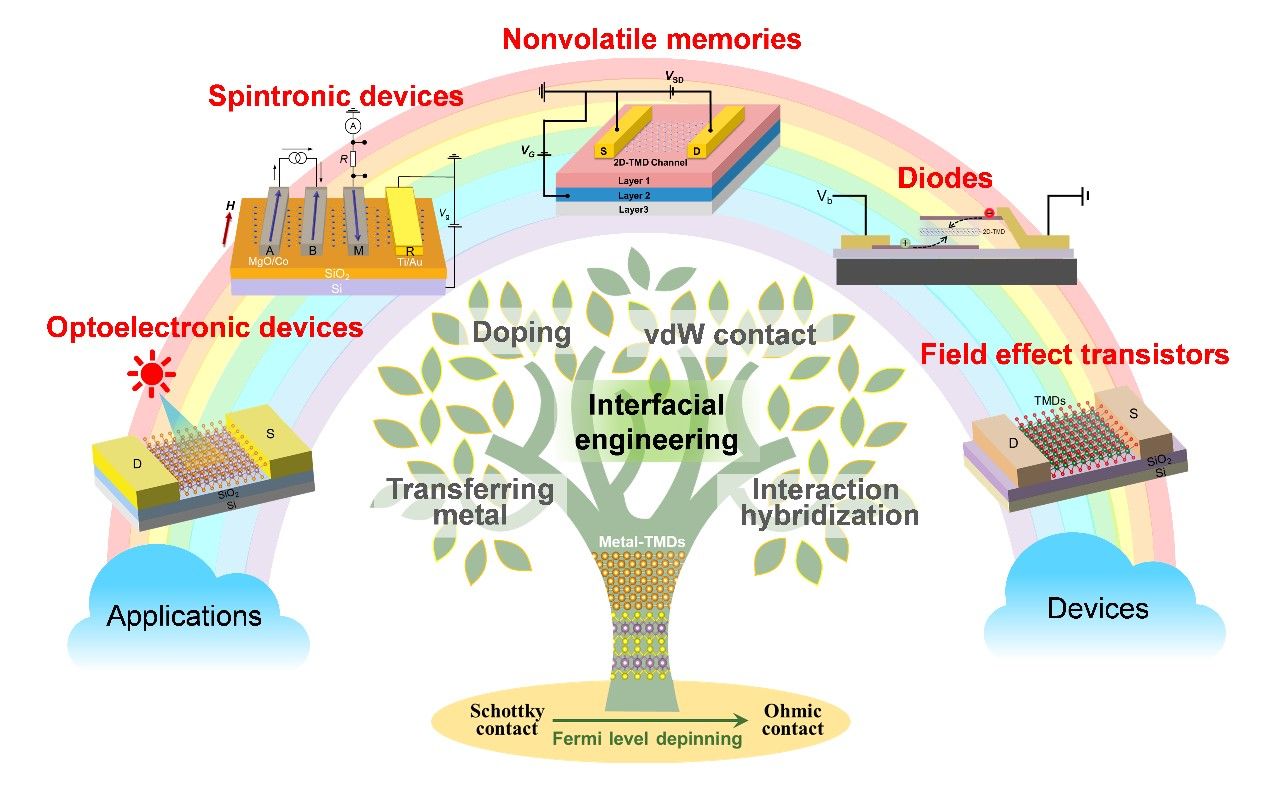 随着对更高性能和更多功能应用需求的持续增长,传统半导体材料的局限性日益凸显,特别是在器件小型化、功耗控制和运行速度等方面。因此,迫切需要探索新型材料和器件架构,以突破这些瓶颈。二维过渡金属硫属化合物(2D-TMD)材料因其特殊的层状结构和优异的电子、光学、机械性能成为了追求材料和器件创新的过程中的最优选择之一,并被广泛应用于各类新型电子和光电子器件中。然而,金属与2D-TMD材料接触后产生的高接触电阻严重限制了器件的整体性能,这主要源自界面处的肖特基势垒和电荷注入屏障。如何有效降低这一接触电阻并优化界面电荷传输成为研究的核心问题,界面工程由此成为提升器件性能的关键研究方向。在这项工作中研究团队首先深入分析了接触电阻的物理起源——费米能级钉扎效应。2D-TMD材料的电学特性在界面接触时受到界面化学成分、晶格失配和缺陷态的多重影响,导致不同金属与2D-TMD材料之间产生了费米能级钉扎效应和进而形成了肖特基接触。接下来这项工作对界面工程的多种优化策略进行了系统梳理:(1)通过电荷转移掺杂或调控界面杂化效应,以优化界面电荷传输特性;(2)选择合适的接触金属或插入缓冲层实现优质的范德华接触;(3)通过表面处理减少界面处的缺陷态,消除费米能级钉扎效应。最后,这项工作还展望了未来的发展方向,2D-TMD将成为先进应用的重要新材料。在基于2D-TMD的器件中,实现超低接触电阻的关键在于界面电子结构的精确调控。通过界面化学和物理特性的协同优化,有望设计出理想的欧姆接触器件并为未来新型低功耗、高性能的2D-TMD器件的设计和开发提供了重要的理论指导。该论文结合现有实验数据和理论模型,为进一步优化2D-TMD基器件性能综述了多样化的解决方案。