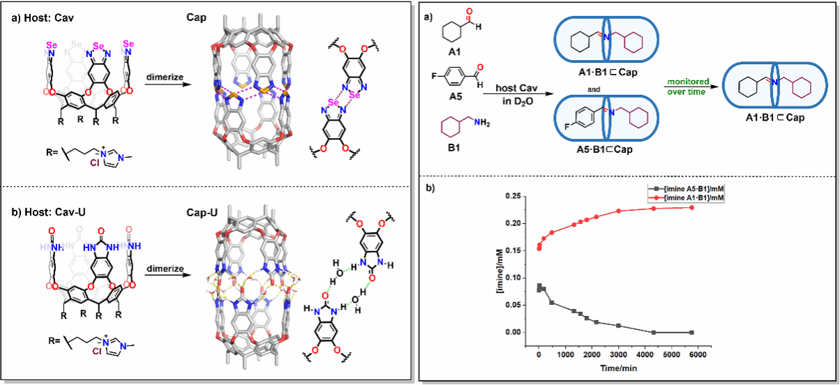 针对上述难题,该研究团队独辟蹊径,巧妙运用水溶性苯并硒二唑分子杯(Cav)组装而成的分子胶囊(Cap)。这种分子胶囊能够营造出完全封闭的疏水空腔环境,为在水相中实现一系列脂肪族亚胺与芳香族亚胺的合成及稳定提供了全新途径。在该分子胶囊体系中,底物醛与胺在毫摩尔浓度条件下,仅需 45 分钟即可实现醛亚胺的高效原位合成,产率高达 90% 以上。一直以来,无论是在有机相还是水相中,脂肪族亚胺的稳定性相较于芳香族亚胺都要低得多,尤其是极易发生水解。然而,该研究团队开展的一系列选择性反应发现,在分子胶囊存在的情况下,动态共价库(DCL)能够高选择性地生成并稳定脂肪族亚胺。其高选择性主要源于以下两个关键因素:其一,底物胺的碱性越强,其反应速率越快,也就越容易被分子胶囊所保护;其二,产物脂肪族亚胺具有较可控的构象,使其与主体分子胶囊在形状和尺寸上具有更高的匹配度。该创新性策略借助大环超分子主体在水中对亚胺进行原位生成与保护,为检测生命体内亚胺的生成提供了一种极具潜力的方法,有望为动态亚胺化学以及相关生命科学研究领域带来新的突破与发展。