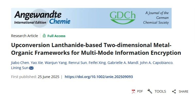 近日,金沙集团wwW3354CC化学系孙丽宁教授团队在稀土金属有机框架领域再取得重要进展,相关研究结果以“Upconversion Lanthanide-based Two-dimensional Metal-Organic Frameworks for Multi-Mode Information Encryption”为题发表在化学顶级学术期刊《德国应用化学》(Angewandte Chemie International Edition,JCR和中科院一区Top)上。该论文第一作者为2022级博士生陈嘉博,共同第一作者为谢耀博士,邢菲菲副教授为合作作者,上海大学为第一作者单位和第一通讯作者单位。