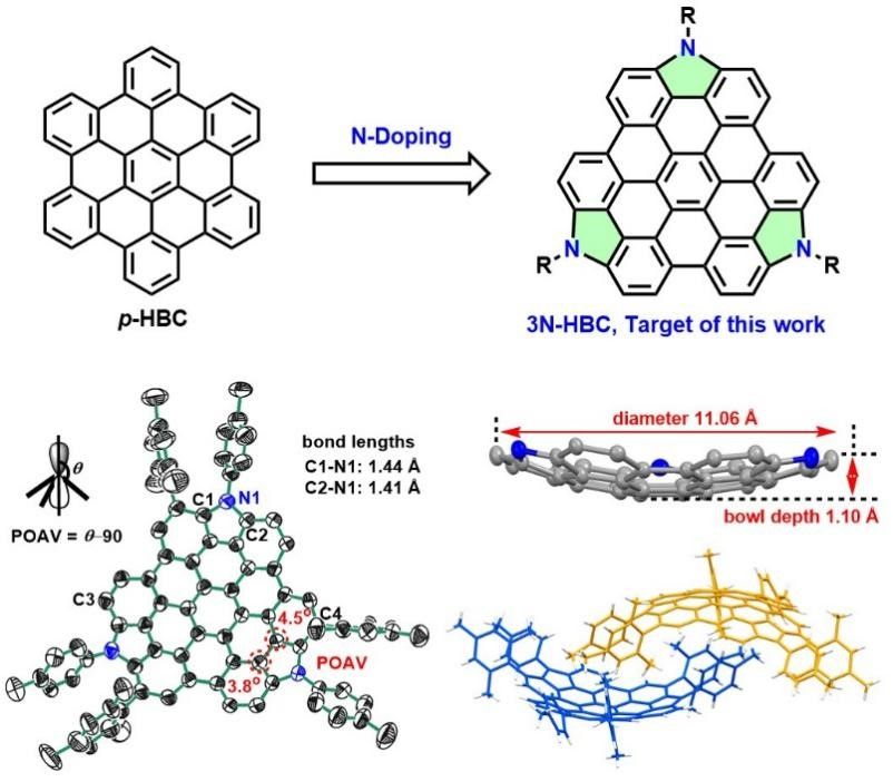 碗状共轭分子(Buckybowl)是一种具有开口、正曲率结构的共轭分子,已展现出了许多独特的性质,包括:动态碗翻转、碗手性、有机铁电性、超分子识别等,并在有机发光二极管(OLED)、有机场效应晶体管(OFET)和有机太阳能电池(OSC)等有机光电材料领域有着十分重要的应用。然而,大共轭的巴基碗受限于其合成难度,目前鲜见报道。一般认为在平面分子骨架中引入足够数量的五元环是合成巴基碗的关键。此前报道中,将p-HBC(对六苯并蔻)这类纳米石墨烯分子弯曲成巴基碗结构时,需在其边界区域全域引入五元环。针对这一问题,研究团队通过巧妙地路线设计仅通过在HBC结构边缘引入三个吡咯五元环结构就实现了将HBC骨架转化为碗状共轭分子(3N-HBC)。值得注意的是,这是HBC骨架构筑氮掺杂碗状多环芳烃分子的首次报道。