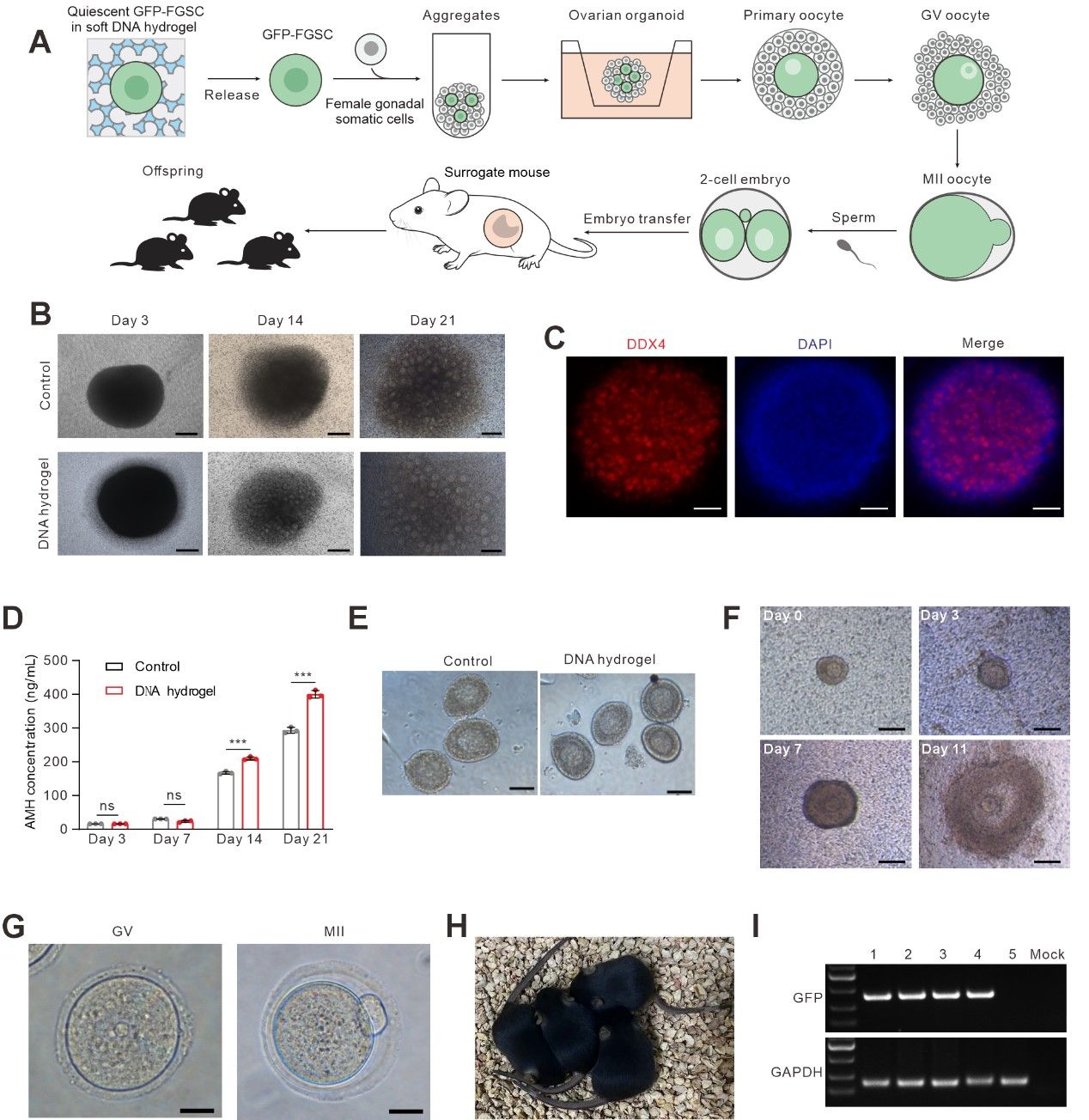 图2.由DNA水凝胶封装的小鼠雌性生殖干细胞发育产生后代