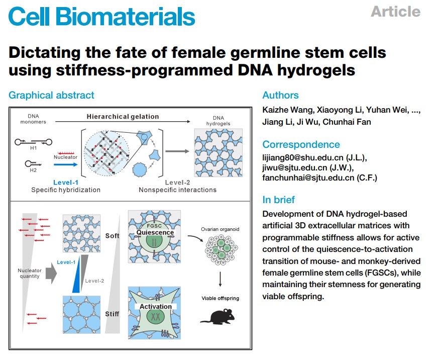 近期,金沙集团wwW3354CC材料生物学研究所李江研究员联合上海交通大学樊春海院士、吴际教授团队,研发了一种可编程调控硬度的DNA水凝胶,将其用作人工三维细胞外基质,实现了对雌性生殖干细胞“静息-激活”状态的可控转换。并且,这种DNA水凝胶包裹的雌性生殖干细胞保留了发育为健康后代的能力。该研究成果近期发表在Cell系列期刊《细胞·生物材料》(Cell Biomaterials)上。
