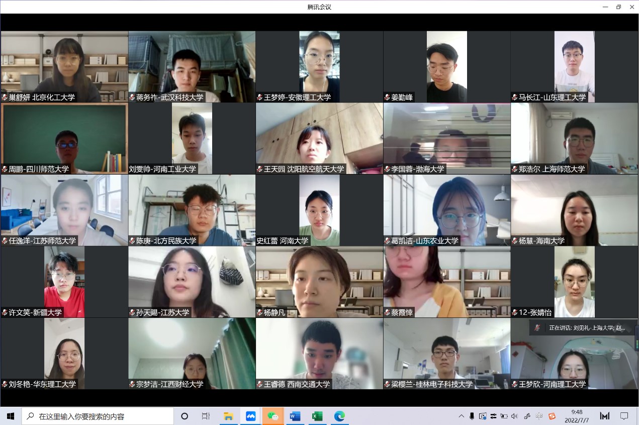 2022年7月7-8日,由我院数学系主办的“2022年我院数学系全国优秀大学生线上夏令营”隆重开营。参加本次夏令营的有来自河海大学、南京邮电大学、南昌大学、内蒙古大学、中国矿业大学、华东理工大学、南京林业大学、扬州大学、新疆大学、海南大学等近70所国内高校的优秀大学生,共计120余名师生参加夏令营。
