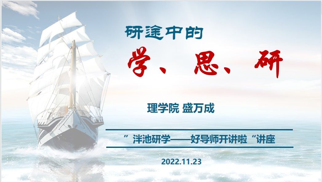 为帮助研究生开启科研征程,提高科研能力,2022年11月23日上午我院数学系盛万成教授在E408会议室开展《研究生的‘学、思、研’》讲座活动,该活动采用线上线下相结合的模式,吸引了来自全校共一百余名老师和同学参加。盛万成老师围绕踏实“学”习、深入“思”考、扎实“研”究、科研经历四个方面作了全面宣讲和深入阐释。