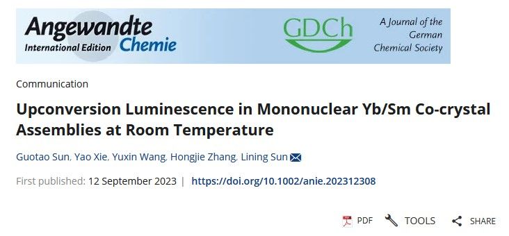 近日,金沙集团wwW3354CC孙丽宁教授团队在分子水平的稀土上转换发光领域又取得重要进展,相关研究结果以“Upconversion Luminescence in Mononuclear Yb/Sm Co-crystal Assemblies at Room Temperature”为题发表在化学顶级学术期刊《德国应用化学》(Angewandte Chemie International Edition,JCR和中科院一区Top)上。该论文第一作者为2020级博士生孙国涛,上海大学为第一作者单位和唯一通讯作者单位。