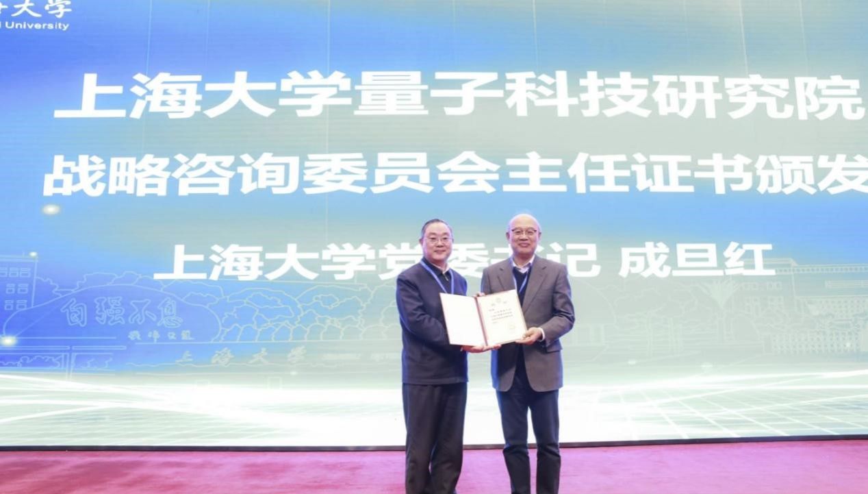成旦红为量子科技研究院战略咨询委员会主任王恩哥、副主任谢心澄、副主任丁洪、量子科技研究院执行院长钟建新及研究院战略咨询委员会委员代表颁发证书。