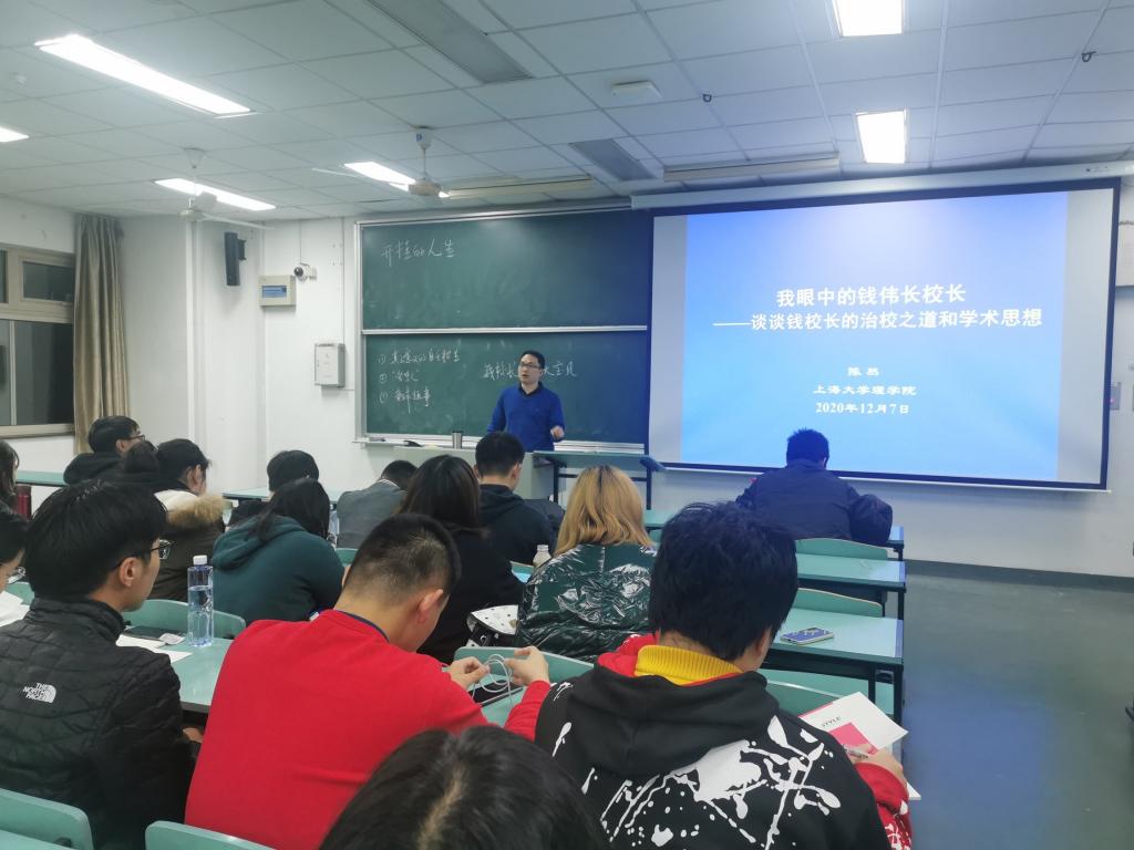 12月7日,金沙集团wwW3354CC20级物理春招班和数学直招班有幸邀请到金沙集团wwW3354CC党委副书记、纪委书记陈然老师为大家开设讲座,讲座主题“我眼中的钱伟长校长——谈谈钱校长的治校之道和学术思想”。陈然老师先为同学们介绍了钱伟长老校长和上海大学的故事,观看钱伟长校长纪录片片段,看到钱校长在任校长期间不求工资、不要房子,兢兢业业,只为将上海大学建设成全国知名一流大学,同学们深受感动。