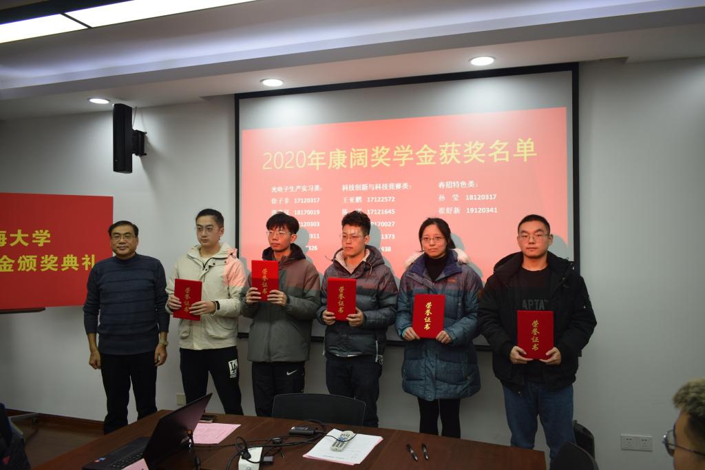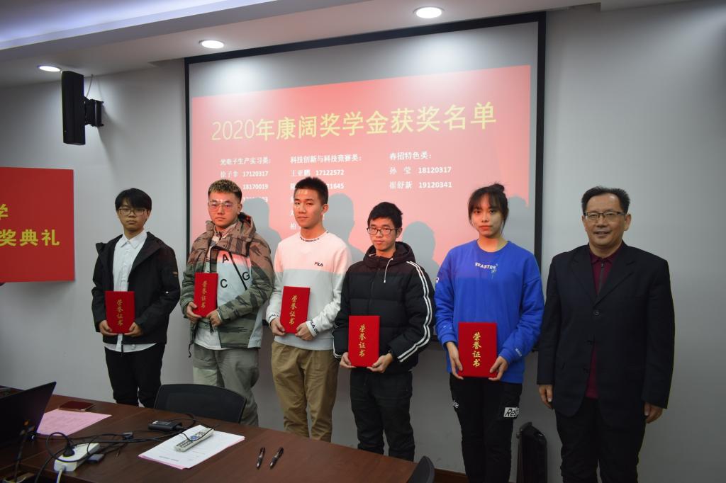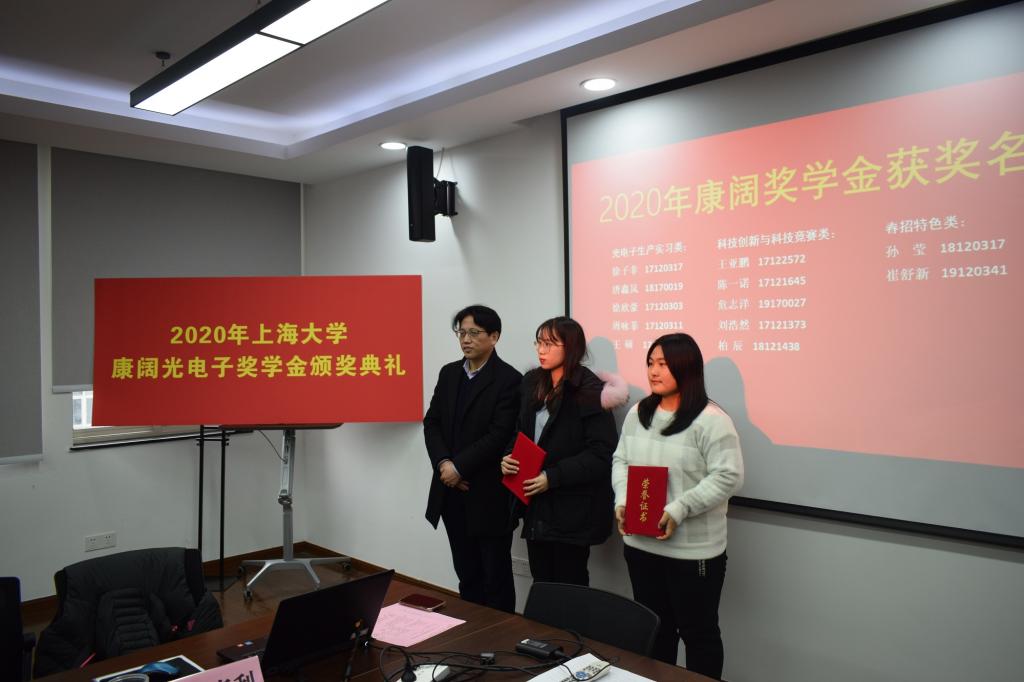 金沙集团wwW3354CC党委副书记姚颖冲宣读了2020上海大学康阔光电子实习奖学金获奖名单,并由黄勇先生、盛万成书记、蔡传兵主任分别为获得生产实习类、科技创新与竞赛类和春招特色类的同学颁发了荣誉证书。