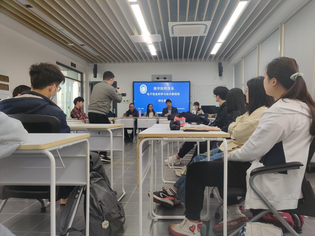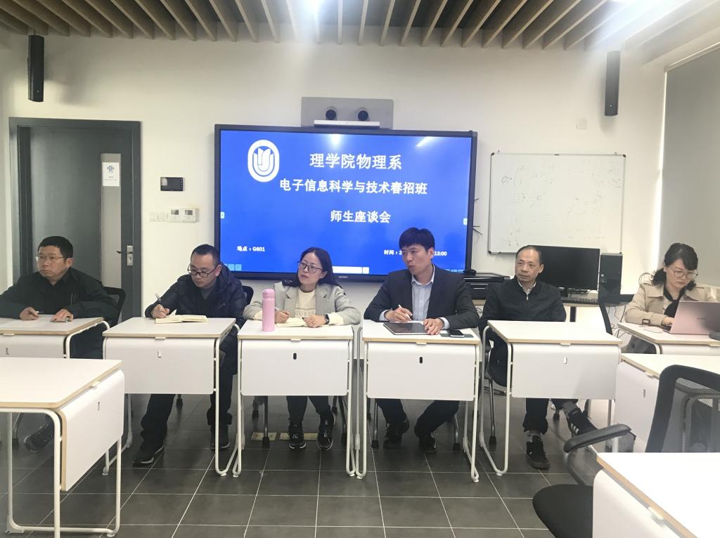 4月16日在G601会议室,金沙集团wwW3354CC物理系电子信息科学与技术专业春招班师生座谈会举行,出席本次师生座谈会的有金沙集团wwW3354CC党委副书记姚颖冲、金沙集团wwW3354CC副院长余长君、物理系党总支书记颜明、物理系副主任张爱林、物理系党总支副书记周青利、物理系班导师张赛峰。本次师生座谈会目的在于了解同学们在学习过程中遇到的问题、收集同学们对于春招班课程设置以及课程安排等方面的意见和建议。