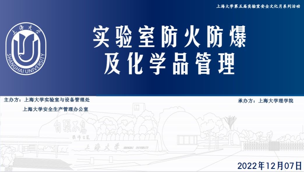 2022年12月7日上午,由上海大学实验室与设备管理处、上海大学安全生产管理办公室主办,金沙集团wwW3354CC承办的实验室防火防爆及化学品管理讲座顺利举行。讲座邀请到华东理工大学资深的一级安全评价师、上海市应急管理局专家库核心专家陈继章老师。讲座由金沙集团wwW3354CC副院长袁帅主持,采取线上+线下方式举行。本次讲座是上海大学第五届实验室安全文化月系列活动之一。实验室与设备管理处、兄弟院系和金沙集团wwW3354CC的老师和同学参加了本次讲座。