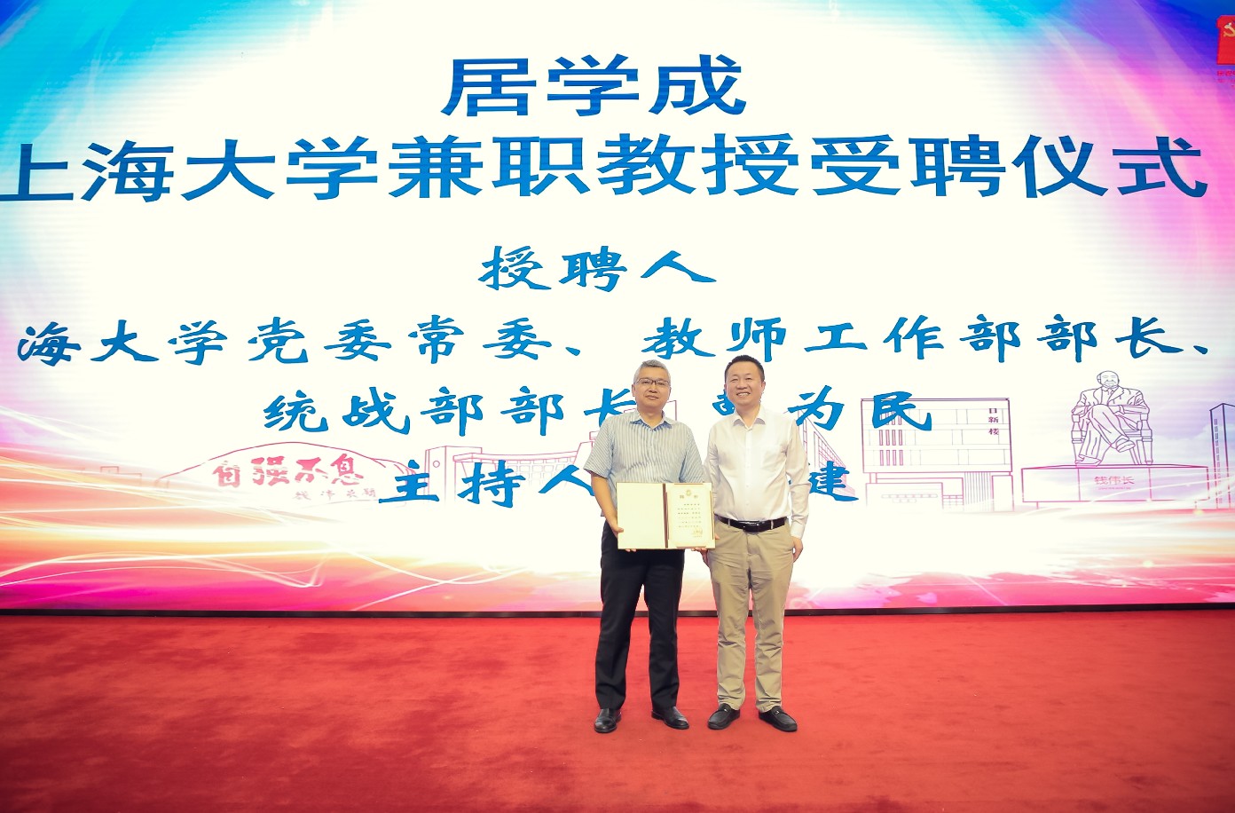 曹为民部长为校友居学成授予上海大学兼职教授聘书,化学系副主任李健教授主持仪式。87级有机化学专业居学成校友在讲话中感恩母校师长的悉心培养,在老科大化学系本硕学习及工作了9年,对母校情深意切,他号召年轻一辈向林院士等杰出校友学习,关心母校发展,积极投身国家科技、化学相关产业建设中,并期待母校跨越式发展。