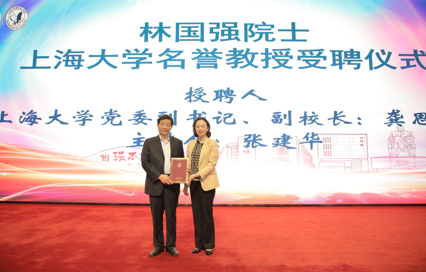 随后,龚书记向林国强院士授予上海大学名誉教授聘书。张建华主任主持仪式并介绍了林院士的学术成就,及设立的国秀奖学金已有7届124名化学系本科生、研究生荣获殊荣,激励莘莘学子爱国爱校、创新拼搏。杰出校友林国强院士讲话前向现场的校友、师生等鞠躬三次,表达了自己对于母校培养的感恩,感谢校友对母校的支持,及对于师生的希冀和祝愿;现场报以雷鸣般的掌声。他回忆了自己在老科大(现上海大学)求学、任系主任、兼职教授等经历,提及3位家人毕业于自己的母校。他表示看到母校化学系的发展十分欣喜,希望化学人能够初心不渝,为了国家民族的繁荣昌盛而砥砺前行。